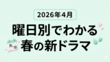2026年春ドラマをまとめてチェックしたいなら、2026年4月ドラマ一覧|曜日別でわかる春の新ドラマまとめ | もおすすめです。曜日別に放送日や主演情報を整理しているので、注目作もひと目でわかります。
